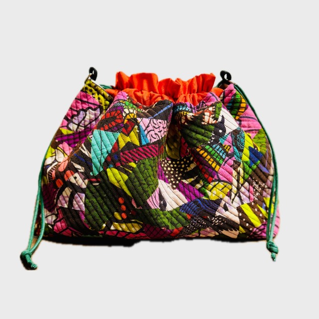 シンプルな巾着ショルダーバッグ。 長財布もすっぽり入る大容量なのに 見た目はコンパクト! 元気カラーのスパイシーパッチワーク®︎のバッグです。